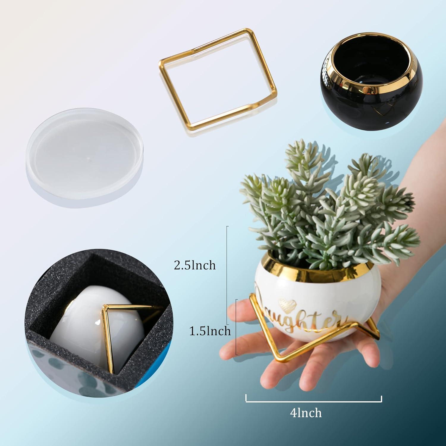 Succulent plants are not included with our flower pots. Our Ceramic planters for indoor plants comes with a gold metal stand and also ideal as best gifts for daughter adult. Standing at 2.5 inches tall and 4 inches wide.