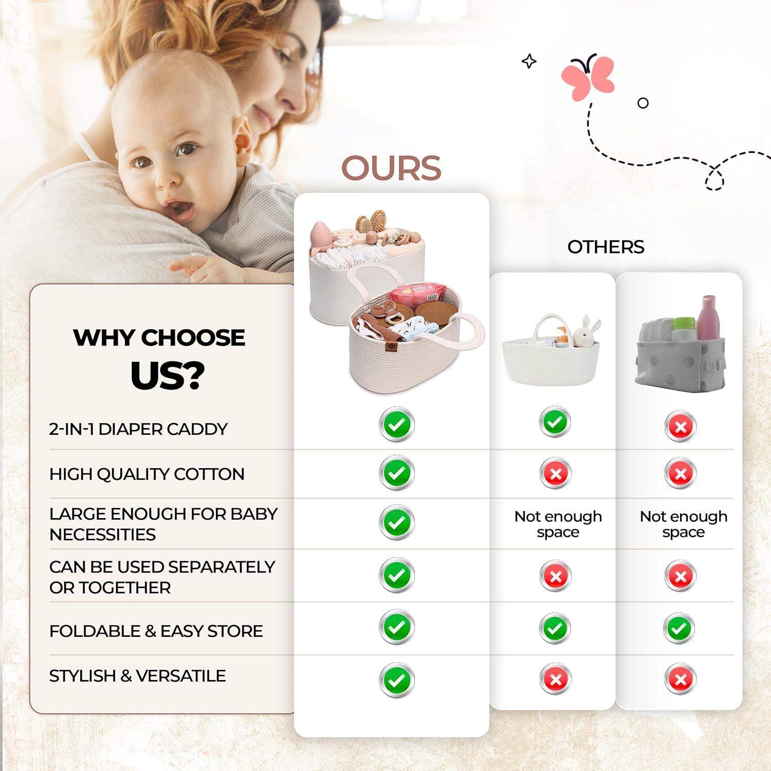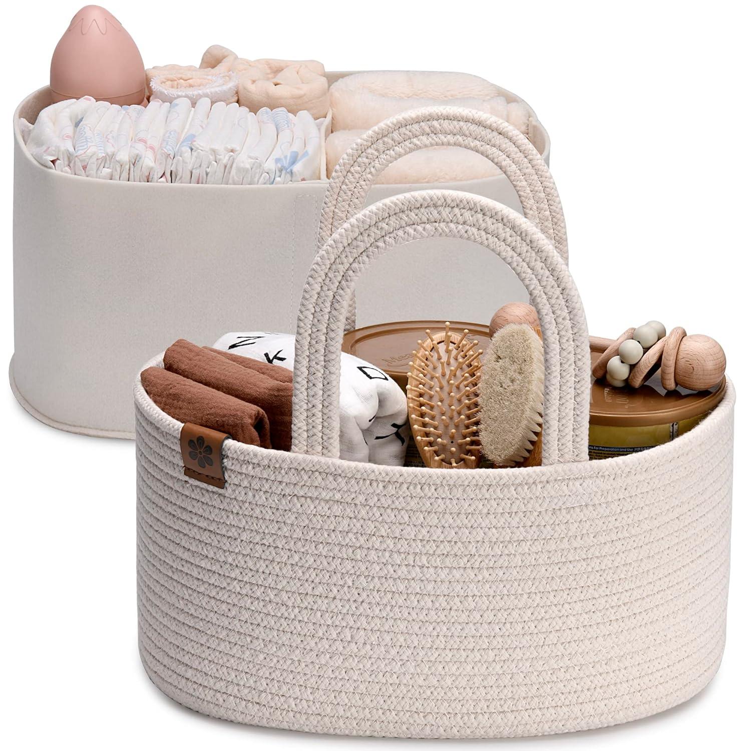 2-in-1 BABY CADDY ORGANIZER OFFERS MAXIMUM VERSATILITY: The felt caddy can be used separately or placed inside the cotton rope diaper caddy for added protection. Perfect to store newborn essentials, baby stuff, baby items and baby necessities