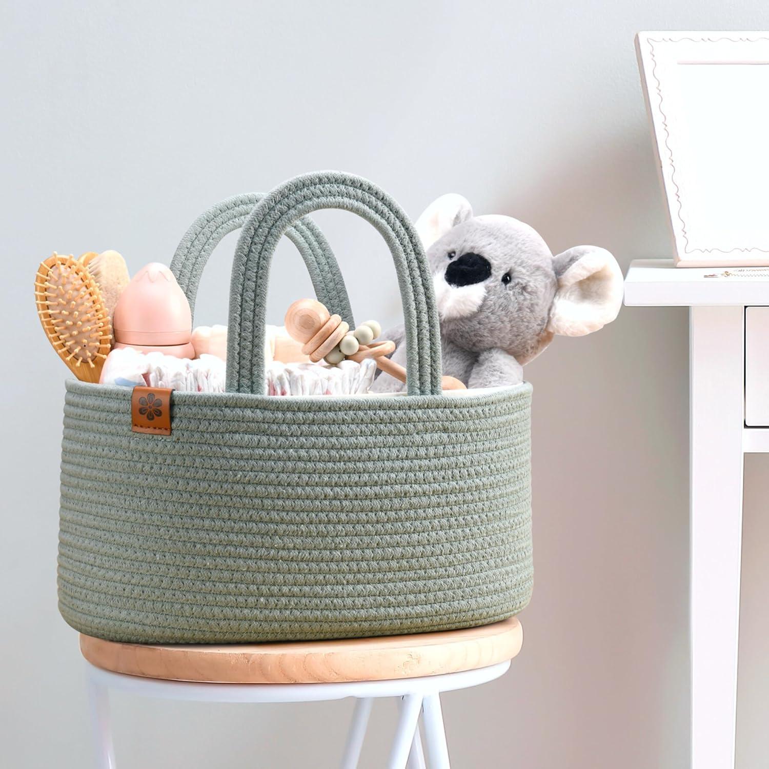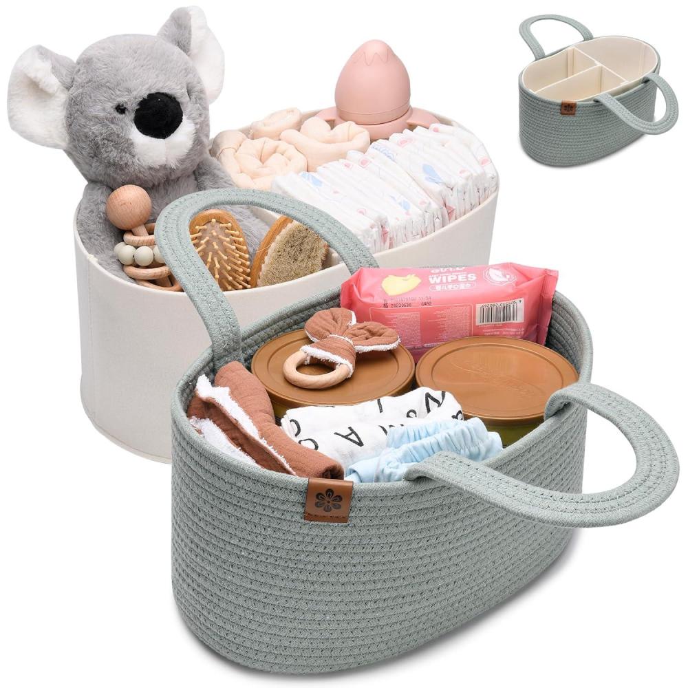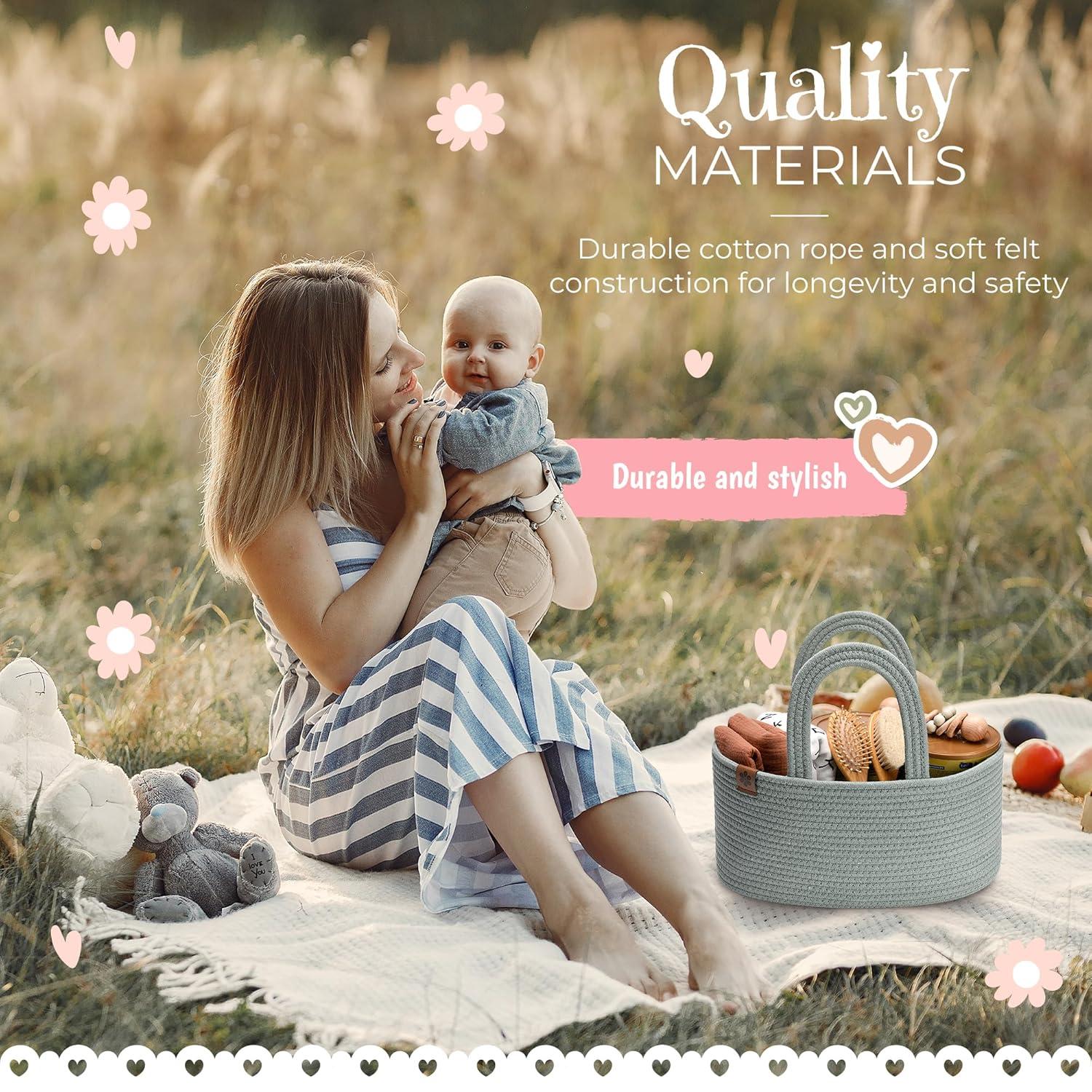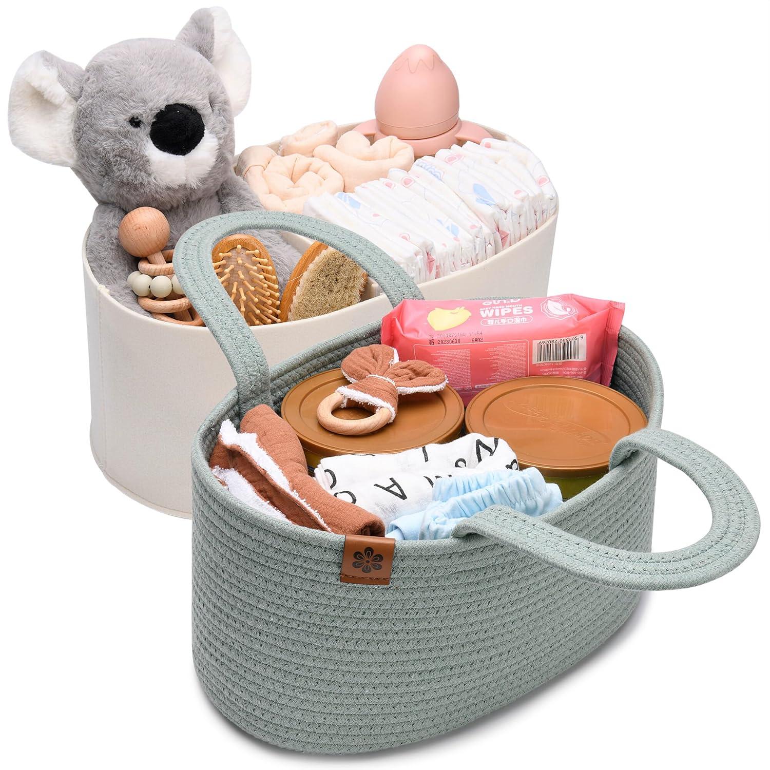 STYLISH & LARGE DIAPER CADDY BASKET SET: The neutral color and modern design of this diaper organizer caddy will complement nursery room. Either use as car diaper caddy, baby shower gift basket or toy storage, your baby essentials are easy to access